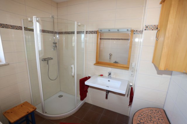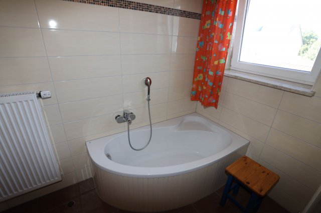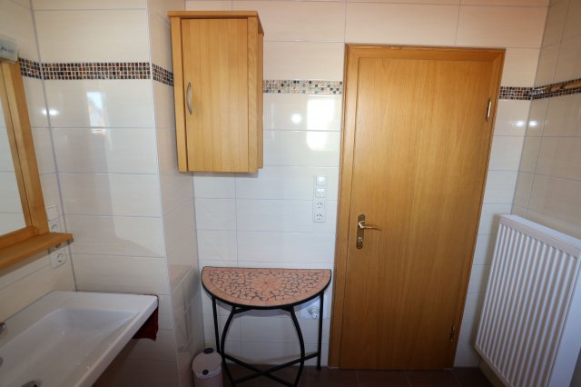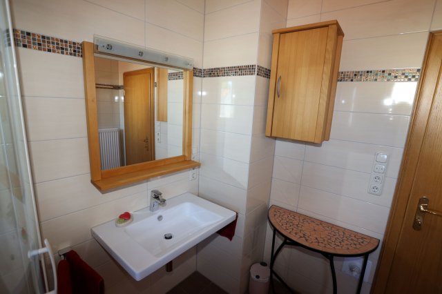 Das Bad ist mit Waschbecken, Spiegel, Wandschrank, Beistelltisch, Dusche und Wanne ausgestattet. Das Bad besitzt ein eigenes Fenster. Die Toilette ist separat.