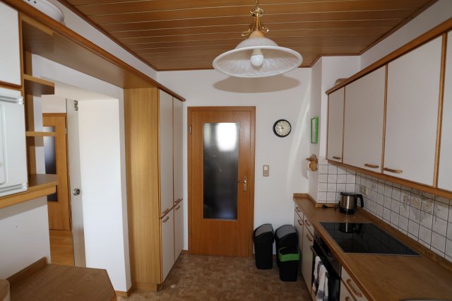 Weiterhin befindet sich in der Küche ein Herd mit Ceranfeld und Backröhre, eine Spülmaschine und ein Kühlschrank mit einem Gefrierfach.