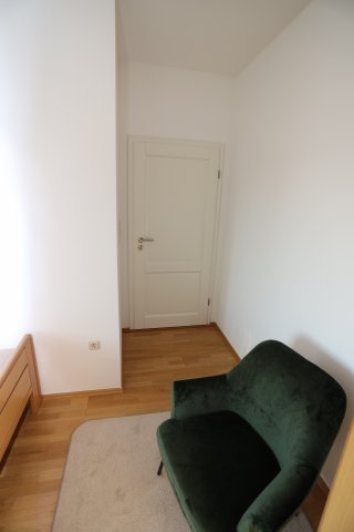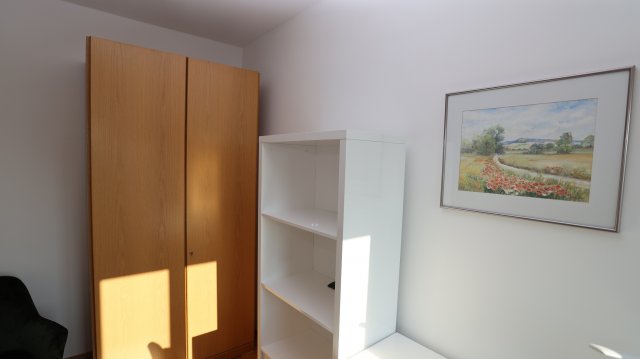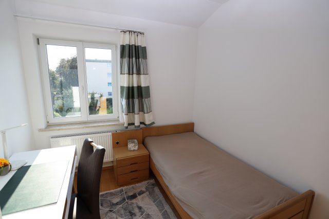 Das Zimmer ist voll möbliert (Bett, Schrank, Schreitisch, Stuhl und Sessel).